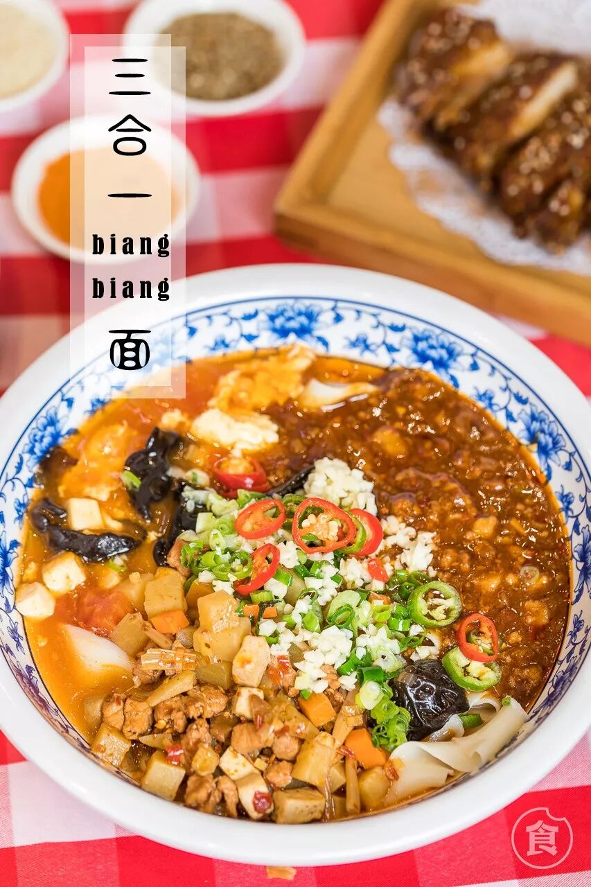 biangbiang面这个名字听起来有点奇怪,原来,是那个复杂到电脑都打不出来的“biang”字呀!加上番茄鸡蛋、土豆肉末和肉臊子三种浇头,十分丰富。