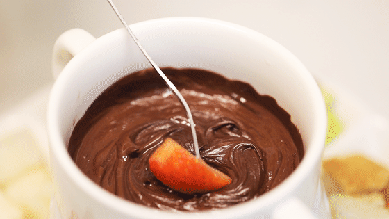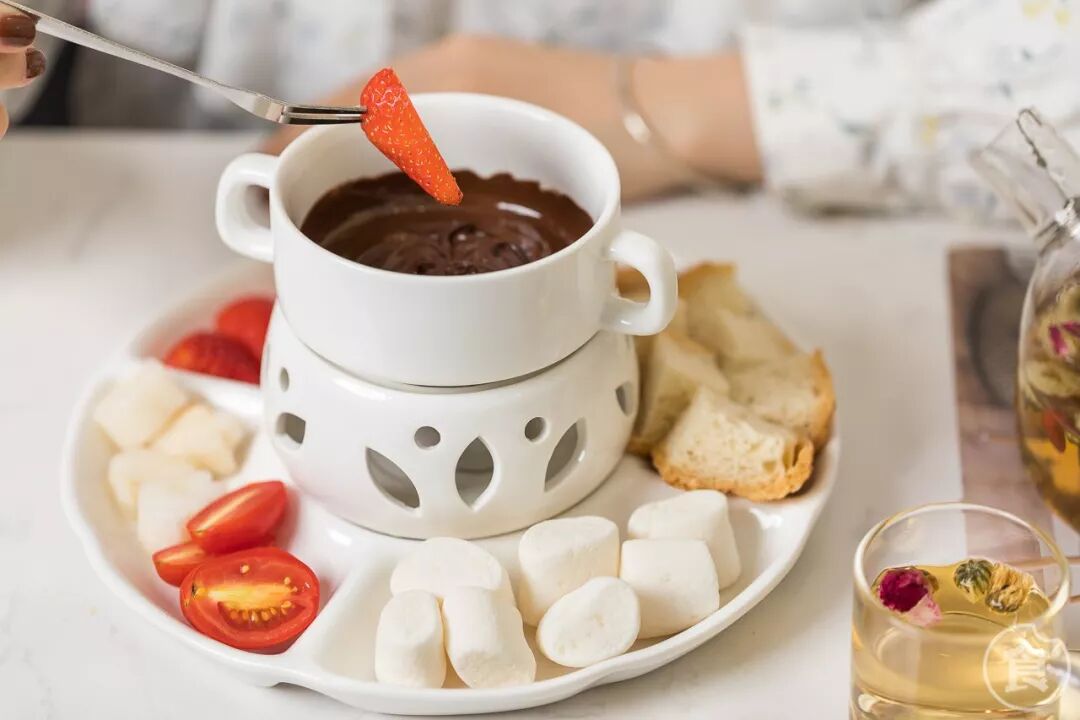 巧克力火锅是一种瑞士火锅。先将巧克力放在瓷锅里煮成汁,再用长柄叉子叉着水果片,蘸锅中的巧克力一口一口吃完。