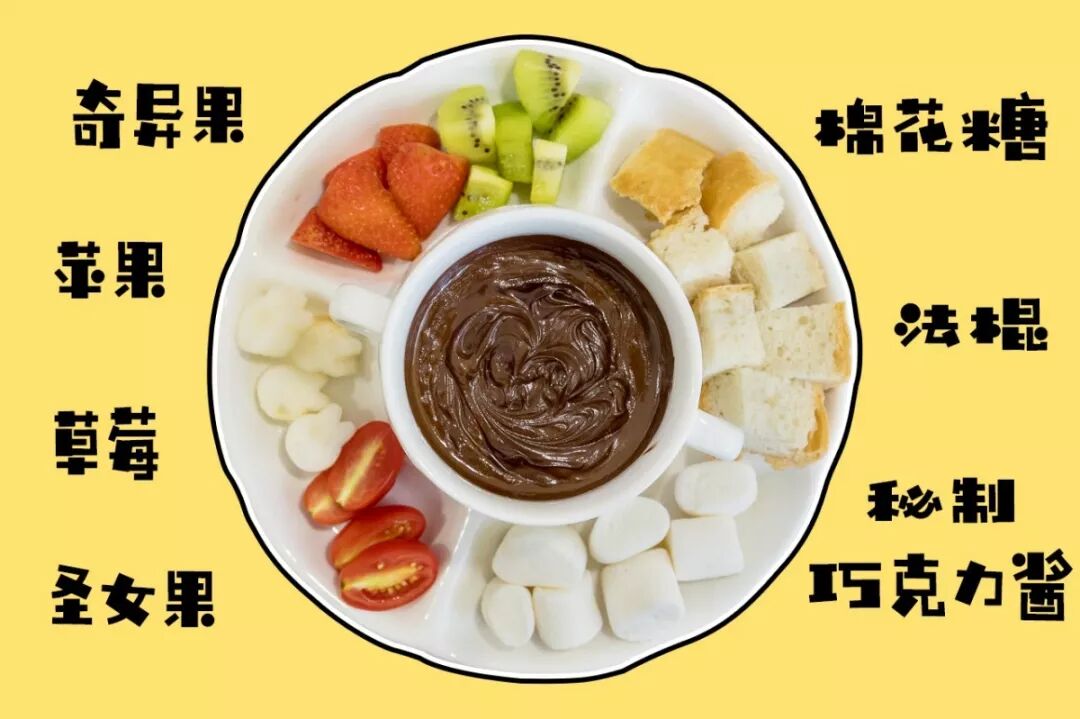搭配巧克力的配料有很多种,从水果到面包,都可任意选择。新鲜水果按季节时段变化,可能每次吃到的东西都会不一样哦~