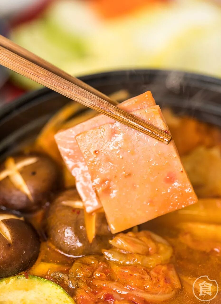 第二步,抢占火腿片。在这沸腾的一锅食材里,仿佛只能看到它。从小吃到大的口味,微咸嫩爽。