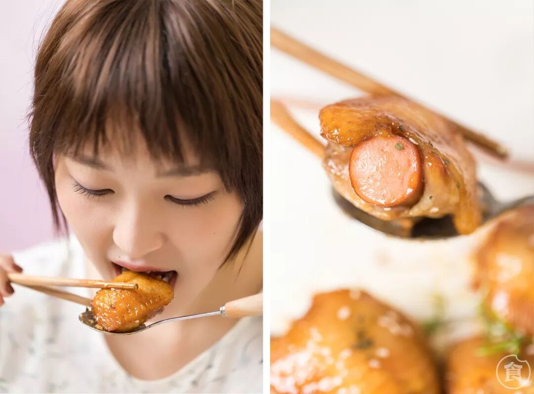 趁热咬破鸡翅外皮,吃到脆皮肠的一刻,还有肉汁爆出!每一口都是香甜鲜嫩的肉感。
