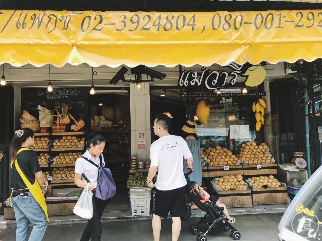 泰国曼谷这家Mae Varee的芒果糯米饭可以说是很火了,据说这家店的芒果糯米饭很多泰国当地人也会经常买来吃,开了有30年~店门口摆着超多超大的芒果,店内还有卖一些水果和果干。