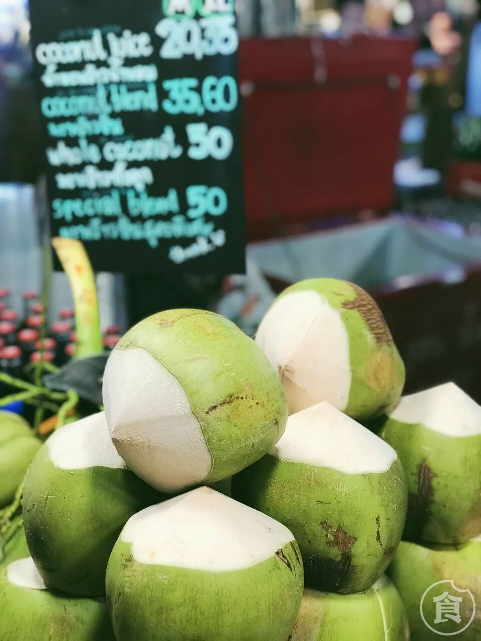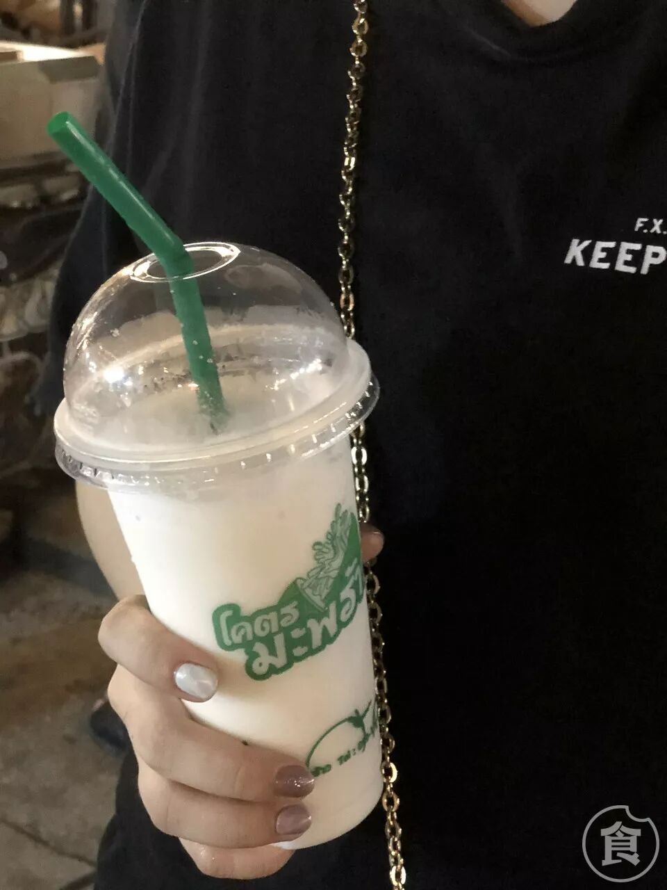 你可以抱着一整个椰青边喝边逛,也可以点一杯椰子冰沙。椰子冰沙比椰青多一些奶味,口感也会更加丰富~在泰国的每一天基本都离不开椰子冰沙和泰国奶茶。