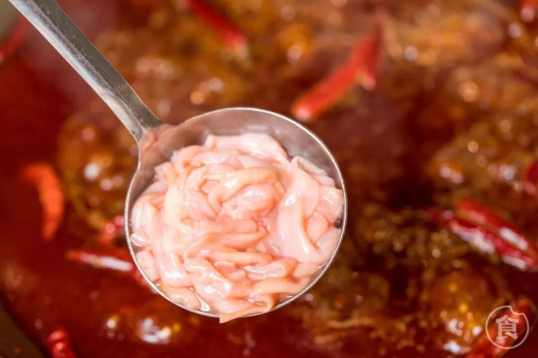 小份的鹅肠全部夹起,分量装满一个小漏勺。处理得干干净净的鹅肠,色泽超级粉嫩,每份只有48小时的保质期,在最大的口感上保持了爽脆。