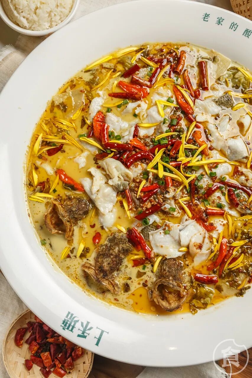 上禾瑭的这盘酸菜鱼,光是小份手机屏幕就已经装不下了。金黄的汤底,鲜红辣椒点缀,那股酸辣的香气早已溢出屏幕,让人狂吞口水。