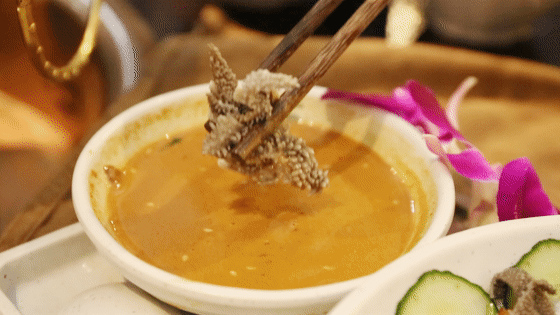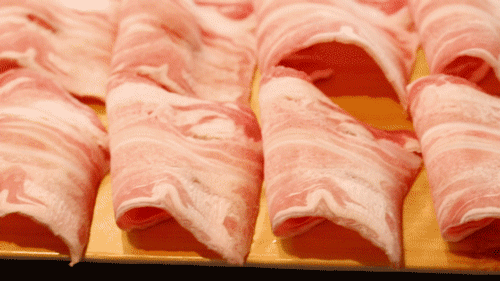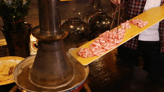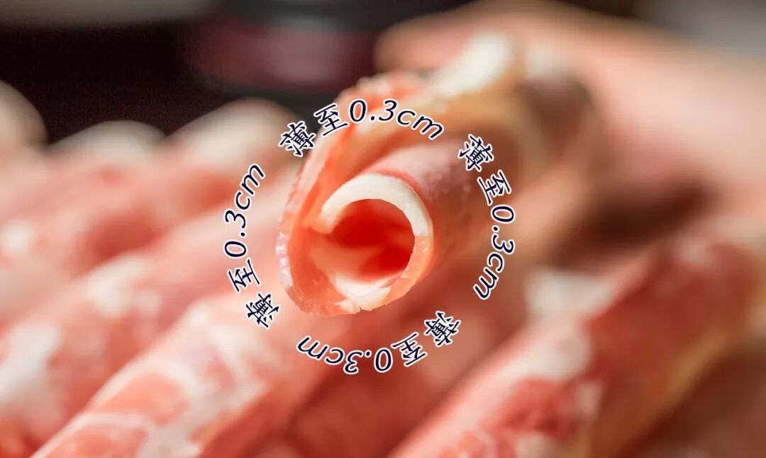 吃这个肉时要一片片地在清汤锅中涮煮,熟后的大片肉,口感非常有嚼劲。