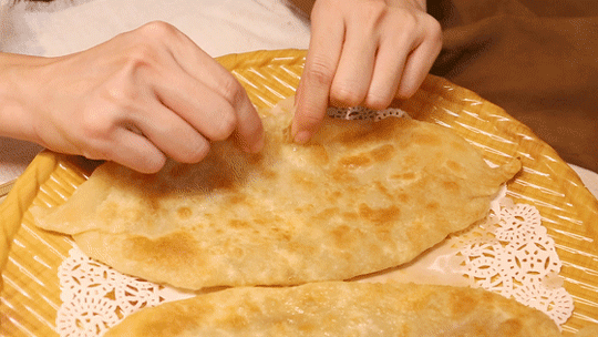 馅饼上桌后,一定要趁热吃。双手撕开外面的饼皮,酥脆有韧劲。