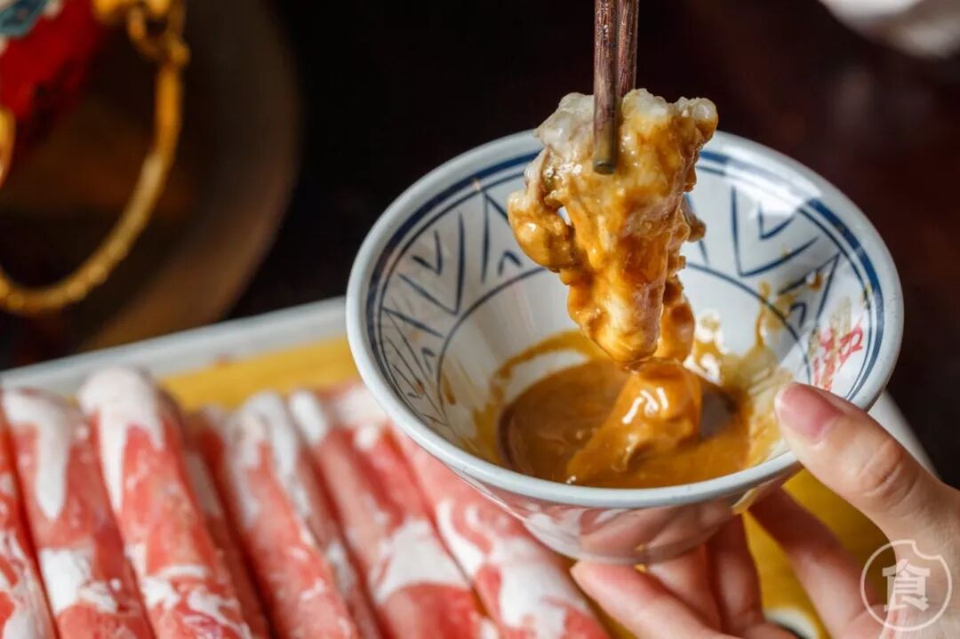 入锅之后的羊蝴蝶肉,羊味会更加浓郁,蘸上麻酱吃起来一点也不柴,口感非常醇香。