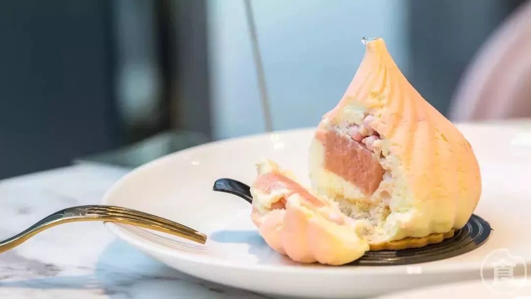 “茉莉慕斯”外表非常好看,粉粉的像个桃子。挖开后,外层慕斯是白色的,有淡淡的甜味。里面的是树莓慕斯,甜甜的糖脆在最上层。口感很柔软,入口即化!非常推荐!!