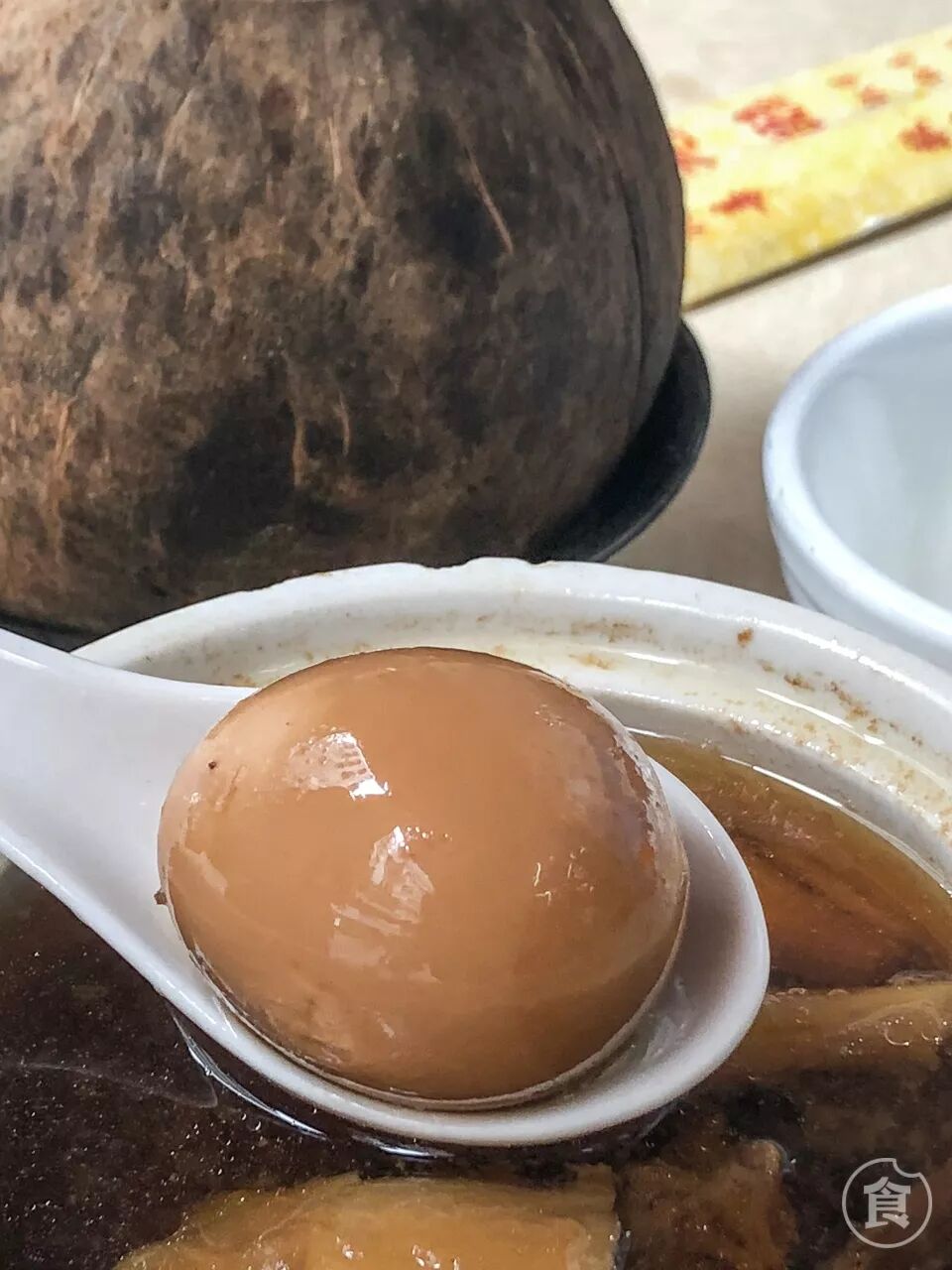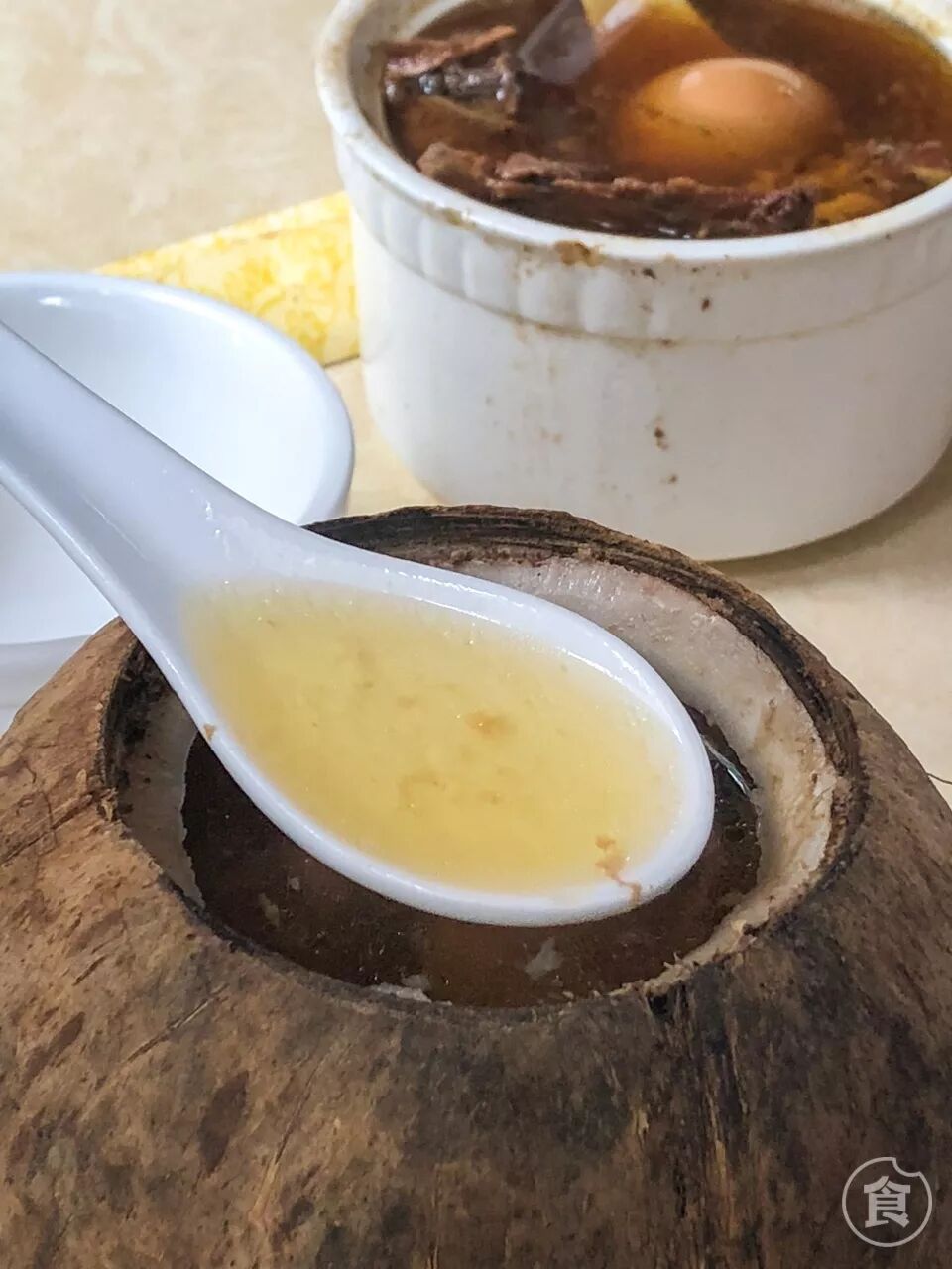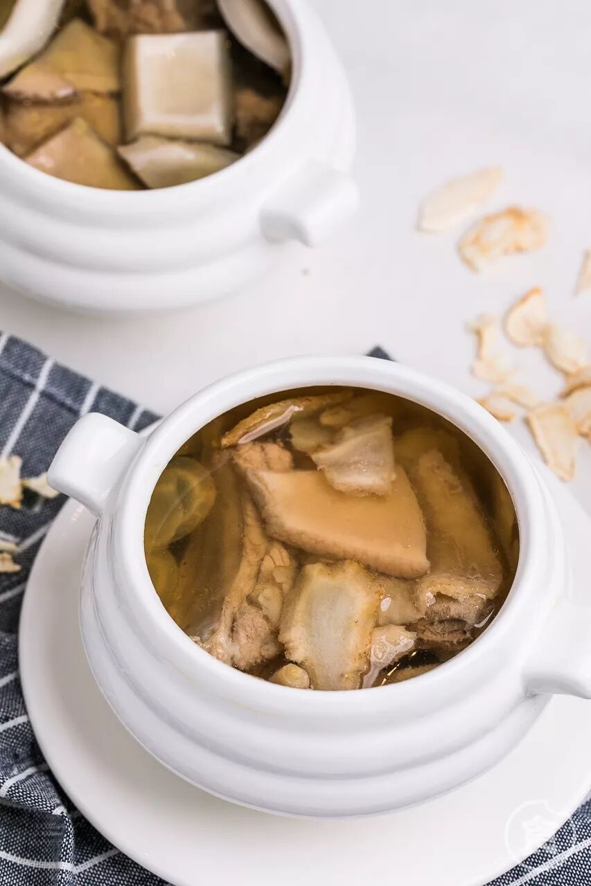 炖盅里的汤加了椰子水,汤水清澈,十分清甜。另外炖盅里还藏着爽脆的椰子肉,吃到也很惊喜。汤水