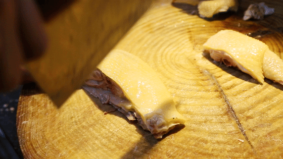 多年厨龄的师傅切起鸡来动作干脆利落。鸡肉被切分得大小均匀,也不会有细碎的骨头残留。鸡皮薄脆,鸡肉鲜嫩,让人吮指难忘。