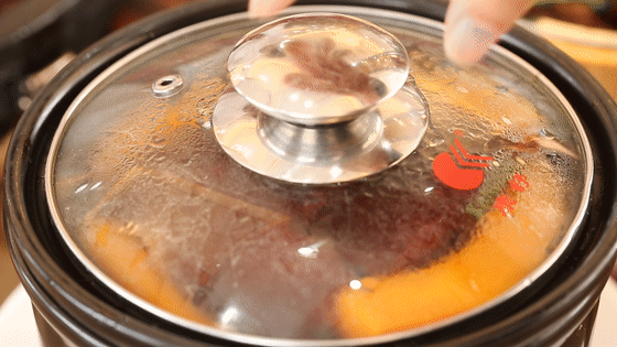 锅下有小火持续加热,酒香四溢,酱汁不断咕噜咕噜沸腾,渗入食材之中。烧肉吸饱了酱汁,醇香入味,南瓜慢慢变得柔软。
