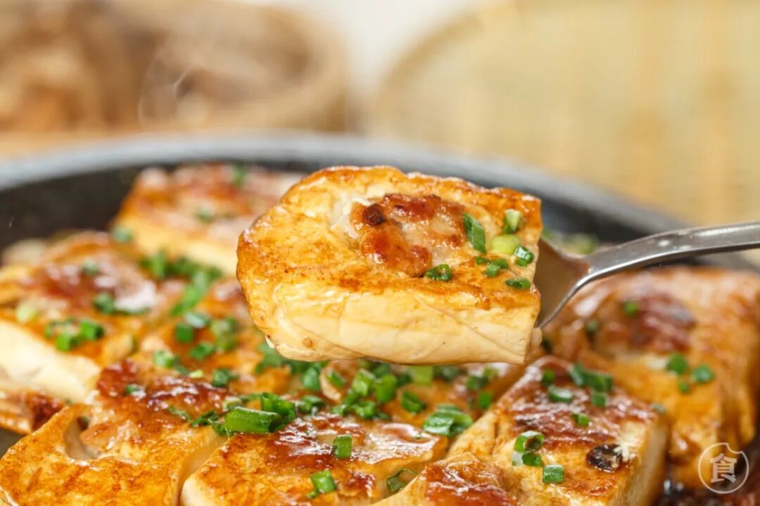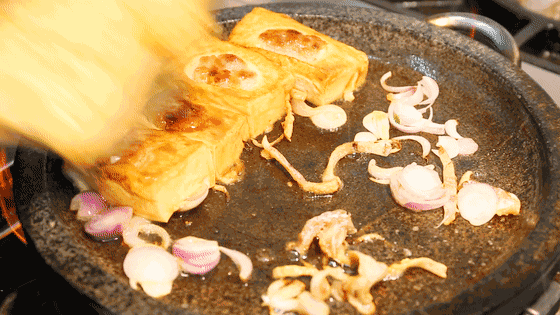 烧热的铁板放入洋葱和鱿鱼丝爆香,将豆腐一面煎至微焦,随即翻面放入铁板,再淋上酱汁,撒上葱花提味。铁板的保温性极好,能在菜品上桌后持续加热,保证极佳的食用口感。