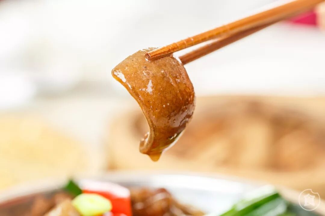 经过柴火焖制的鲜嫩牛仔肉,吸饱了酱汁,咸香入味。富含胶原蛋白的牛皮则是十分Q弹,每次到这里吃饭,牛仔肉是必不可少的一道菜。