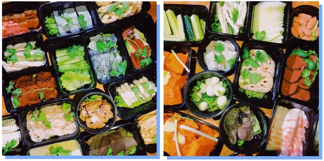 外卖盒里收揽了许多打火锅的必备食材,从肉食到素菜,应有尽有。就连火锅的“锅”都已备好,整体体验感要打高分!
