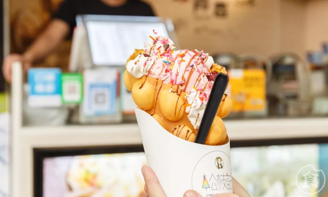 粉色的草莓雪糕和奶油交融着,层层叠叠,被金黄色的鸡蛋仔包裹着。上边再洒上五彩的小糖颗和巧克力酱料。