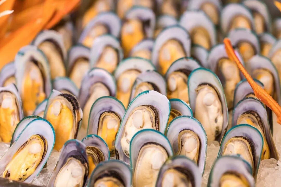 冰镇海鲜区有青口、花螺、基围虾和阿拉斯加大蟹钳等选择。青口肉质新鲜大个,蘸上芥末酱油一起吃非常美味。