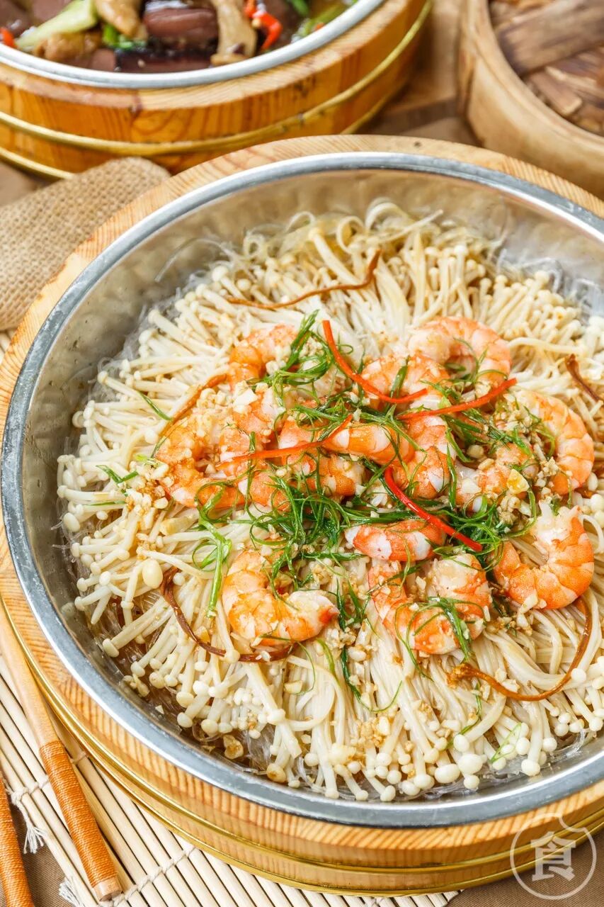 鲜虾下铺满的金针菇和粉丝,吸收了蒜蓉的香和大虾的鲜,拌一拌底部的酱汁,也是十分下饭。