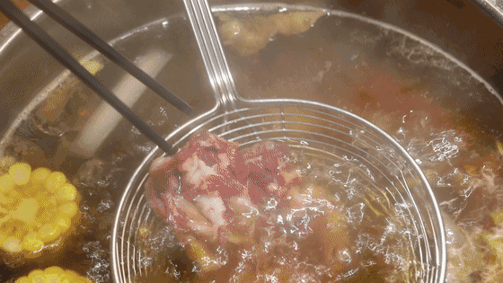 先在捞勺上放小许酸菜,按瘦到肥的下肉顺序涮肉。把酸菜和牛肉一起吃,尝到酸爽滋味后,相信你吃多几碟肉是不成问题的。