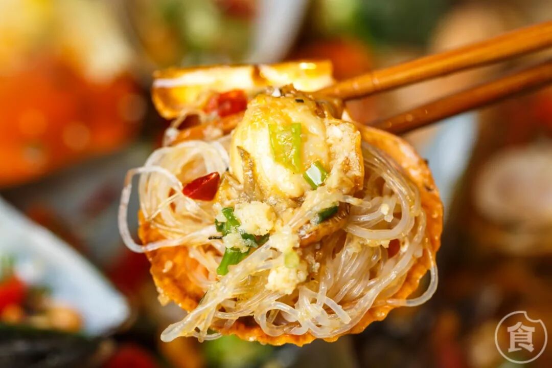 扇贝,带子肥嫩肉厚,垫着粉丝,沾着点点蒜蓉和葱花,在酱汁沸腾的咕噜声中渐渐入味。一口一个,别提多满足了。