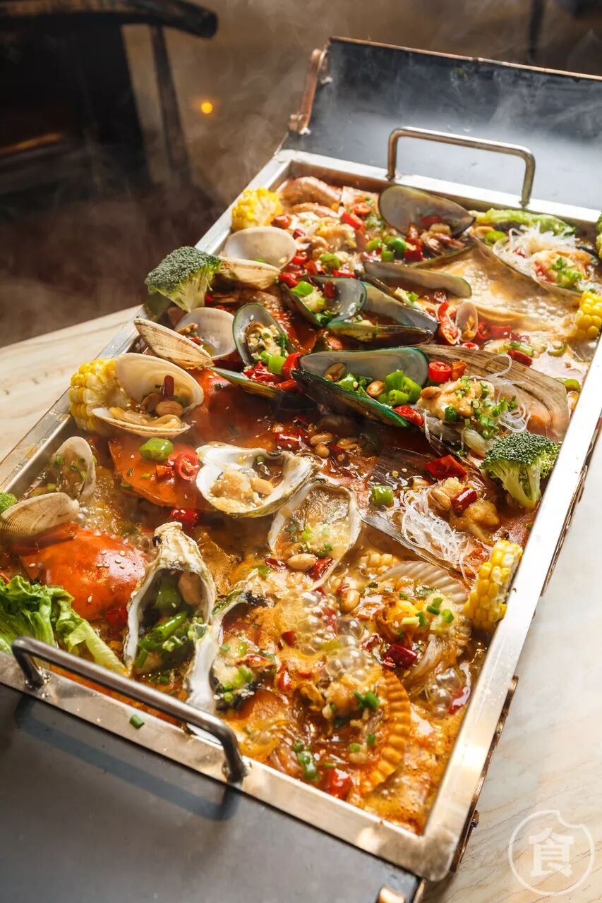 海鲜船装着满满当当的各种海鲜,底部持续加热,汤汁逐渐渗入海鲜里,蒸腾的烟雾,是温暖舒适的烟火气。