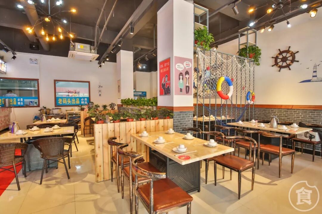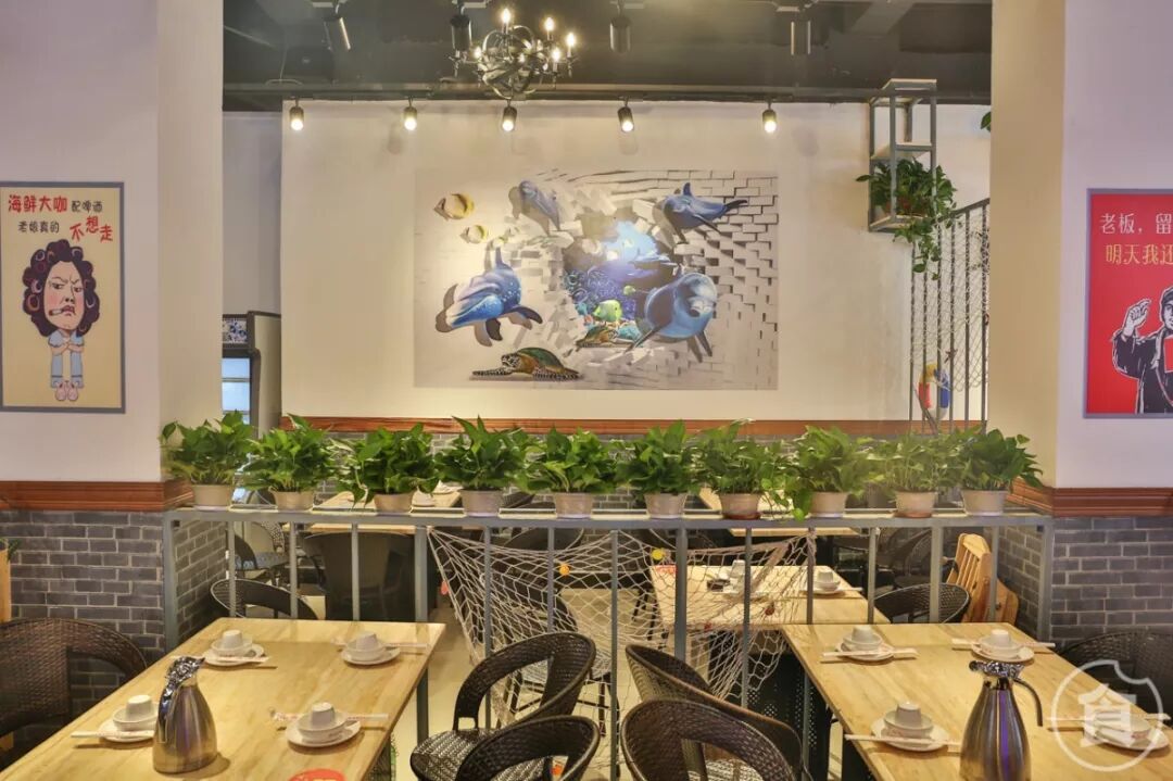 海豚壁画,渔网,泳圈等装饰,让人仿佛置身于码头边。墙上妙趣横生的标语更给用餐时增添几分趣味。
