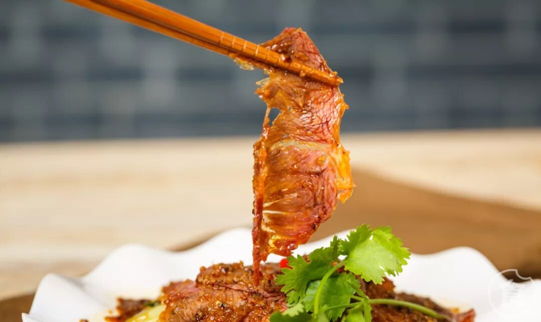 牛肉切得薄到透光,淋上辣椒麻油,香辣而柔嫩的口感很过瘾,用来下酒再合适不过了。