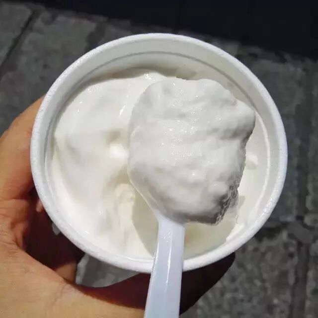 雪糕用泡沫杯装着,其貌不扬。它的口感介于刨冰和冰激凌之间,有一点点碎冰又很细腻,椰子的味道很清爽,醇香细滑。