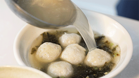 雪白浑圆的鱼丸全靠手工打制,让鱼肉中的蛋白质发生物理变化,才形成它独特的爽脆弹牙口感。