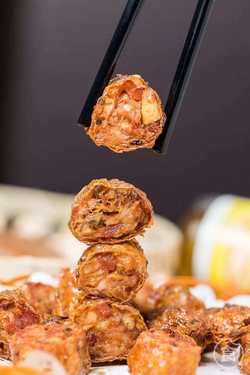 芋丝广章浓香酥脆,萝卜丝广章柔嫩清香,肉卷广章饱满而有嚼劲。推荐的吃法是蘸上潮汕传统酱料金桔油,酸酸甜甜的很是解腻。