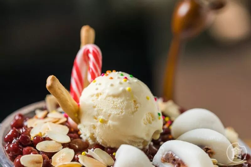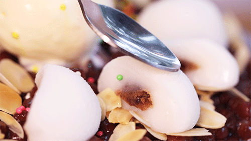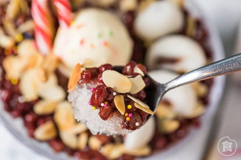 加上雪白的红豆麻薯和喷香的烤杏仁片