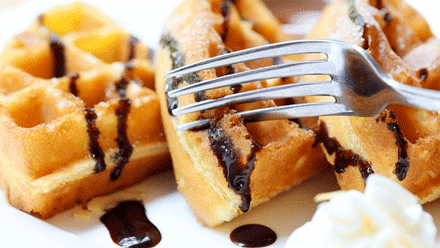 丝滑甜柔的巧克力酱落在华夫饼的格子间