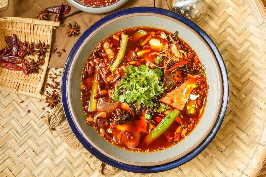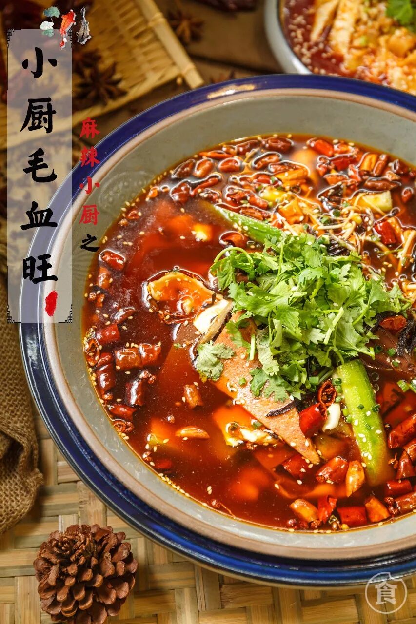 毛血旺的出现,是一位卖杂碎汤的大婶偶然在杂碎汤放入血旺,发现血旺越煮越嫩,味道更鲜;久而久之改良成了现在的毛血旺。