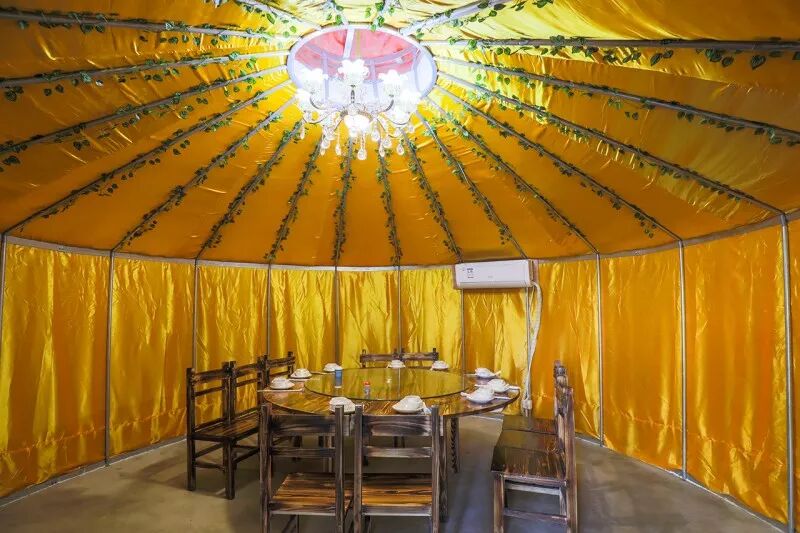 适合聚餐的蒙古包包房,约能容纳10-15人,空间宽敞明亮,包间有内置空调,无论是家庭聚会还是朋友聚餐,独立的蒙古包都能满足你的需求。