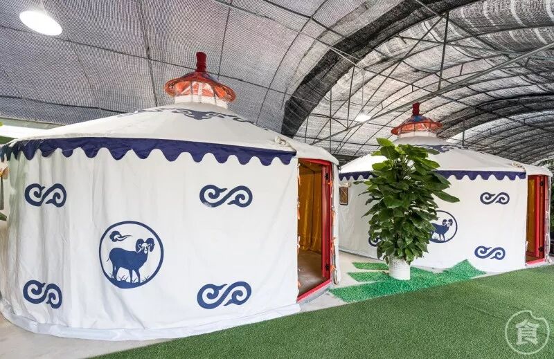 农庄内还有特色蒙古包包间,单个独立蒙古包,仿佛来到苍茫的大草原,蓝天白云绿草地很有画面感。