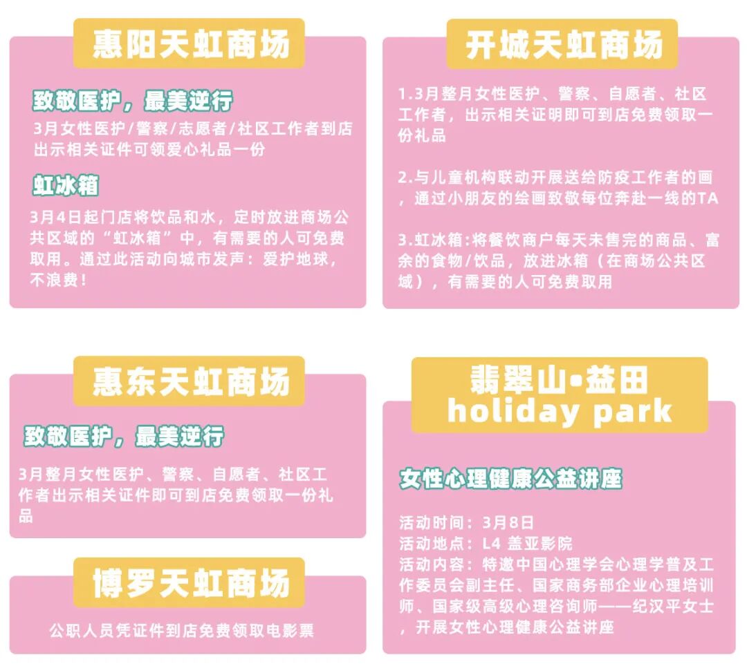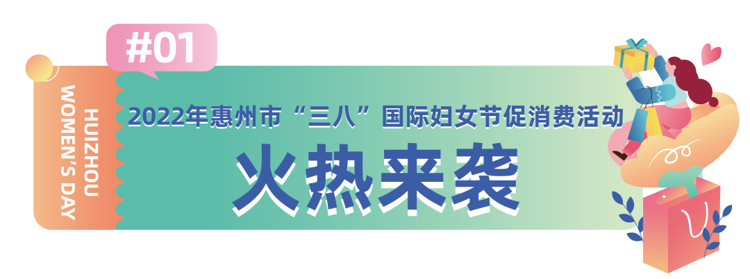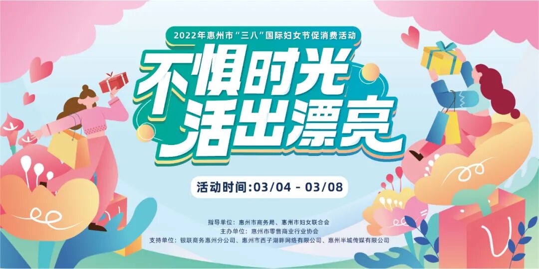 【2022年惠州市“三八”国际妇女节促消费活动】是由惠州市零售商业行业协会在惠州市商务局及惠州市妇女联合会的指导下,组织全市各大商场、超市开展线上、线下相结合,以“不惧时光,活出漂亮”为主题,制定了一系列女性专属福利促销活动。