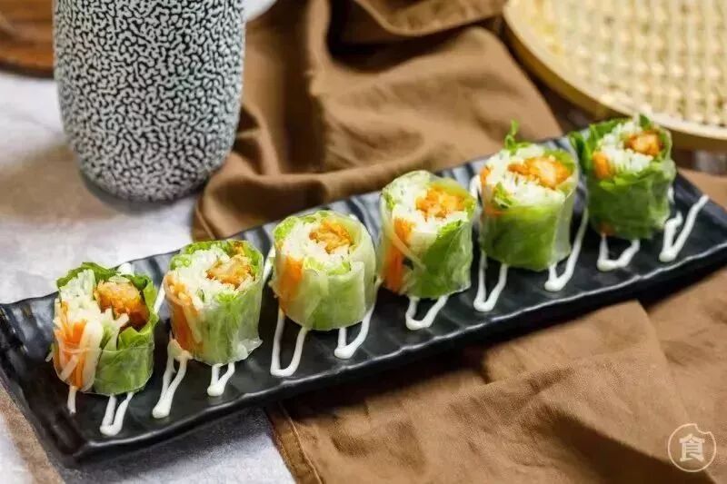 用一层透薄的春卷皮将炸虾、青瓜丝、胡萝卜丝卷成卷物状,犹如把属于夏天的颜色包裹在一起,清新的视觉享受让人胃口大增。