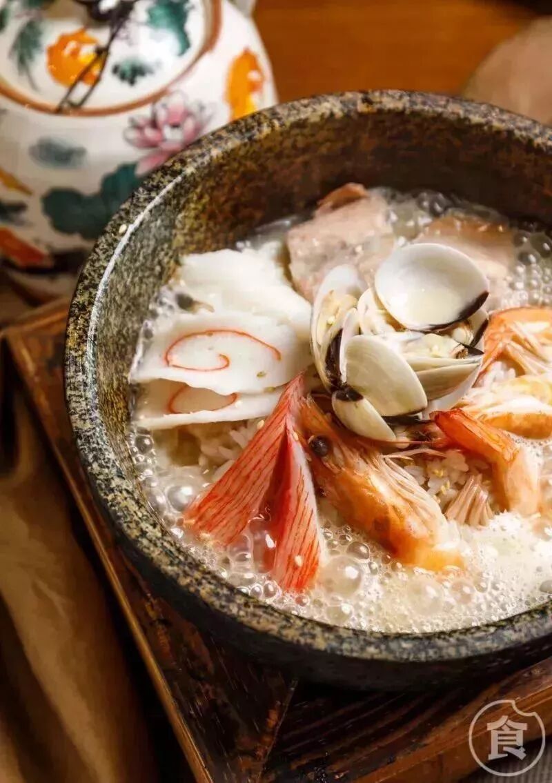 浓汤倒入滚烫的石锅,随即扬起一阵海鲜和米饭的甜香味,石锅发滋滋滋的声响,米饭,海鲜,汤汁此时此刻融为一体,香气扑鼻。