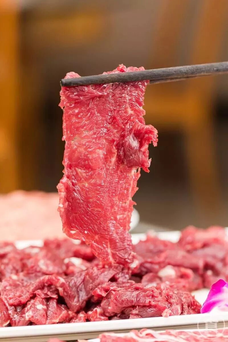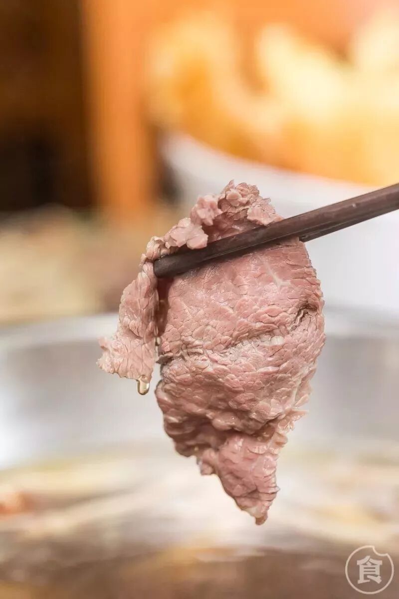 正宗的潮汕火锅必须明档切肉,新鲜牛肉就摆在大家面前,师傅会把牛细致划分部位,不同部位不同切法,手起刀落,肉片片落下…