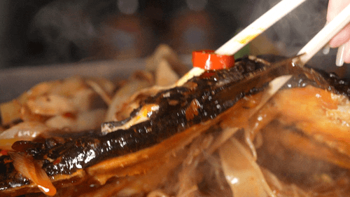 盯着这红彤彤的一大份烤鱼,谁能忍得住口水?新鲜的巴沙鱼放在铁盘上烤制,透着鲜味儿的鱼肉,搭配浓郁酱汁和丰富配菜,光闻着香气,就想一人霸占整锅鱼!