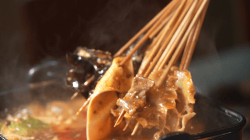 香辣热锅小串满足你不同的需求,毛肚、豆皮、鲜菇等十多串统统都有,汤底中香辣火热的米丝才是“狠角色”!