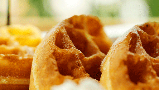 浓郁的巧克力酱浇淋到香脆的华夫上