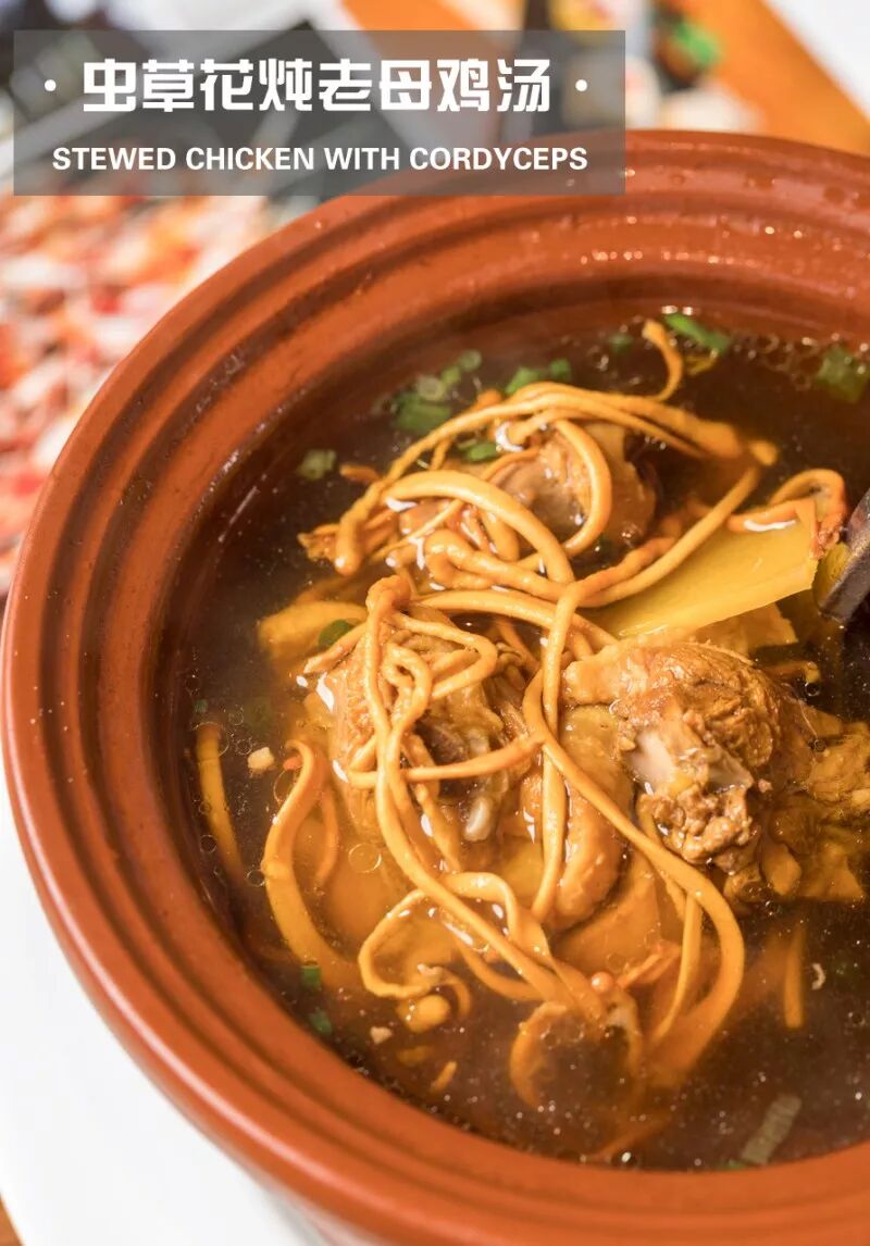 汤色清澈透明,虫草花令鸡汤金灿灿的格外诱人
