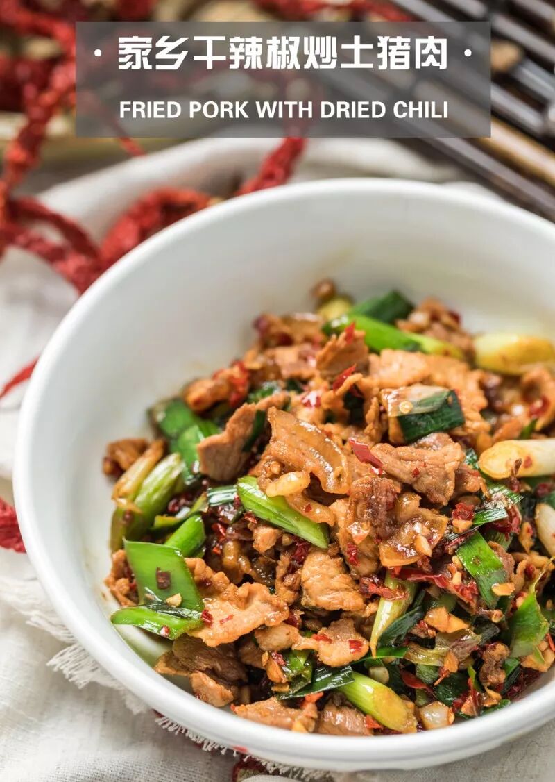 用切成薄皮的猪腿肉与家乡辣椒一起爆炒
