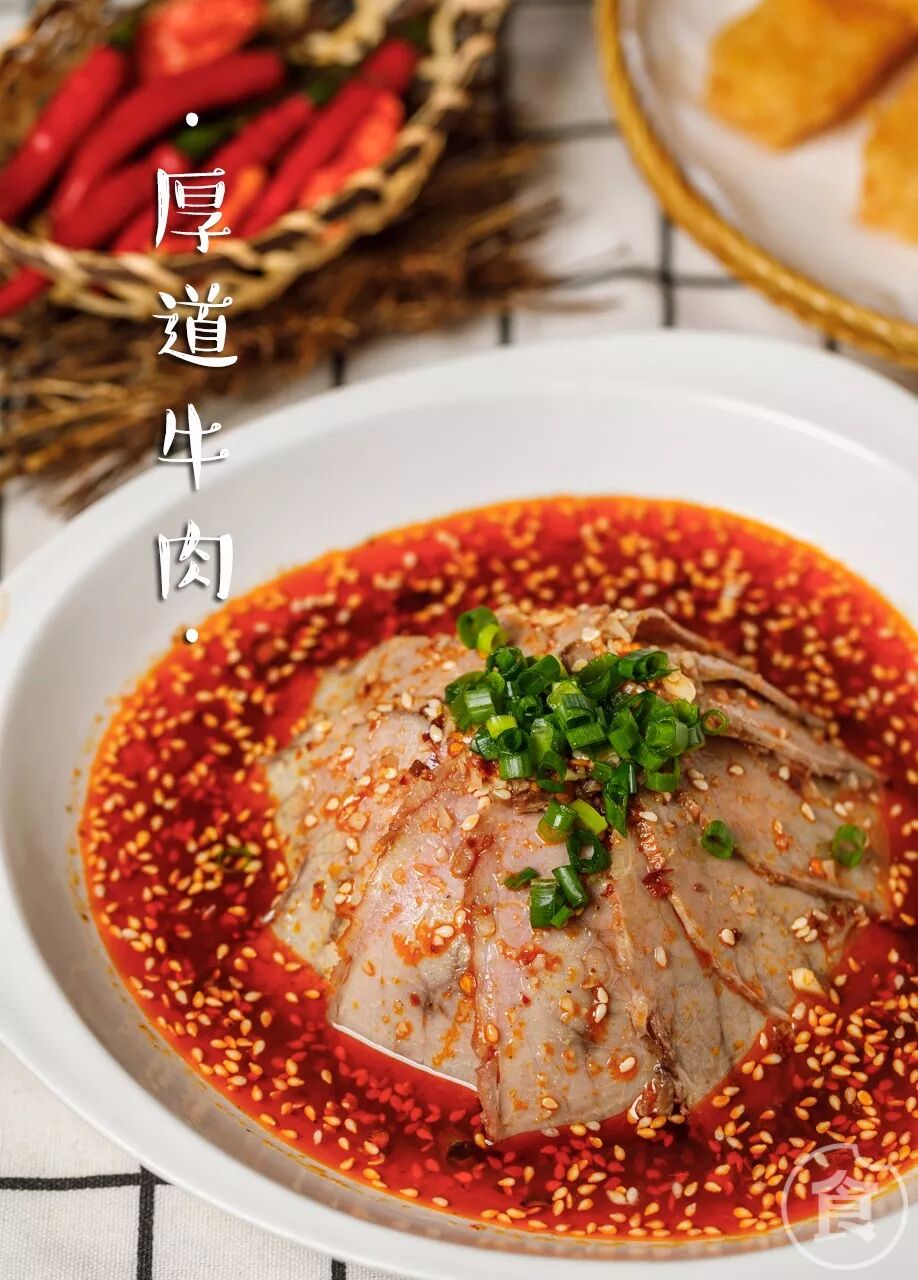 /厚道牛肉/ 逆着纹理处理牛肉,切成厚薄均匀的肉片,越咬越有肉味。吃完一定要吃一口其中的黄瓜条,能收住整体的味道哦。