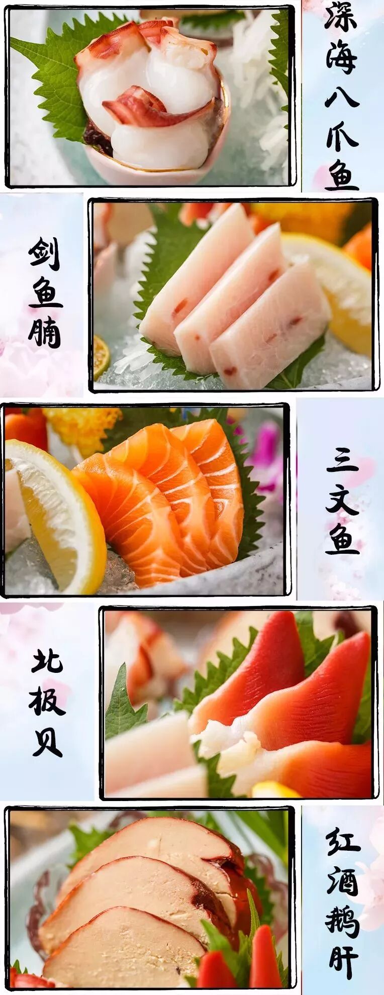 喜欢刺身的小伙伴,这到刺身小拼盘一次过满足你的5个小愿望。包含了:红酒鹅肝、深海八爪鱼、北极贝、三文鱼、剑鱼腩,这5款可以说是符合了大伙的口味了。