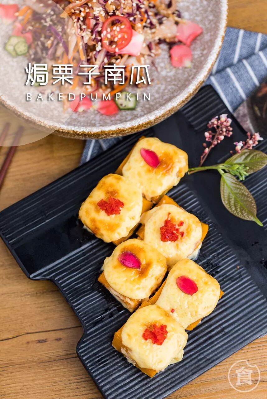 /焗栗子南瓜/在含有特别香气的栗子南瓜,淋上一层焗酱,微微烤炙的表面散发了些许焦香。在咸香中的软糯南瓜,味道浓而不腻。