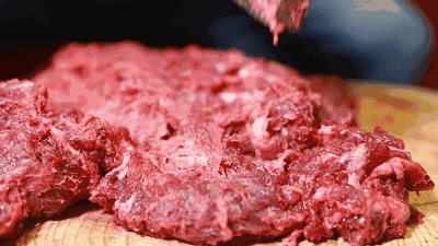 一头牛中,能入牛肉火锅的部分,其实不超过1/3。用方形捶刀将大块牛肉敲打成肉浆,力道与速度都要均匀适中。