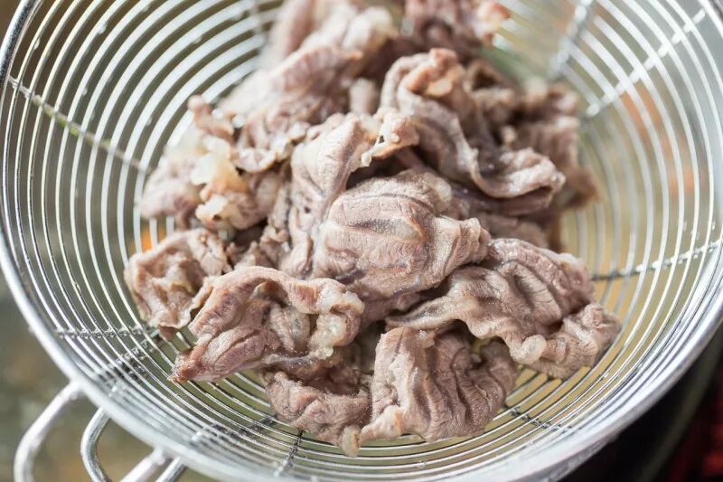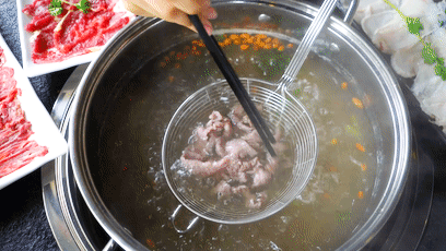 片好的牛肉必须尽快食用,清汤慢火煮至小沸,以漏网盛肉入锅抖散,三浸三晾起,蘸上调好的酱料即可入口。
