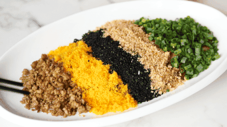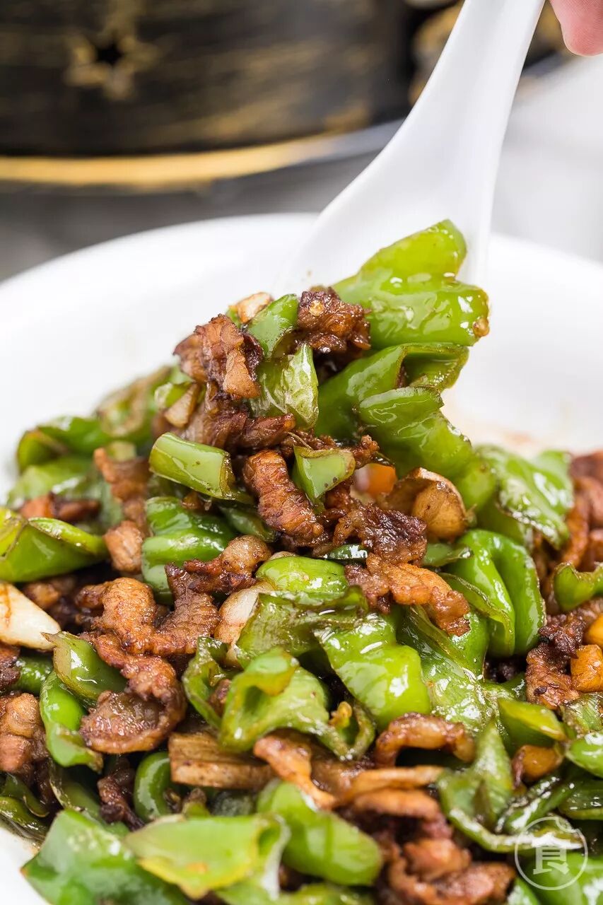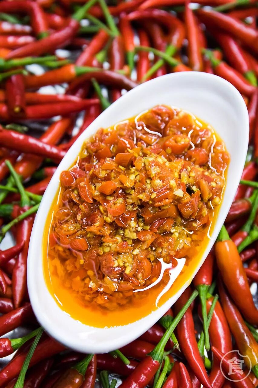 鲜辣的线椒和被搅碎的皮蛋混在一起
